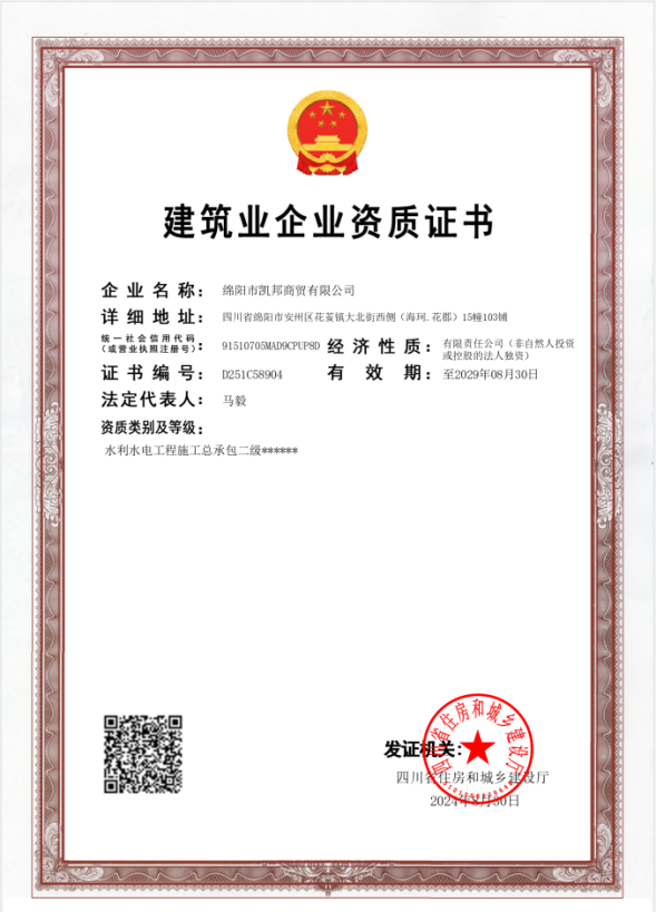 近期,经四川省住房和城乡建设厅严格审核批准,yl34511线路中心下属子公司绵阳市凯邦商贸有限公司成功荣获“水利水电工程施工总承包二级资质”证书。