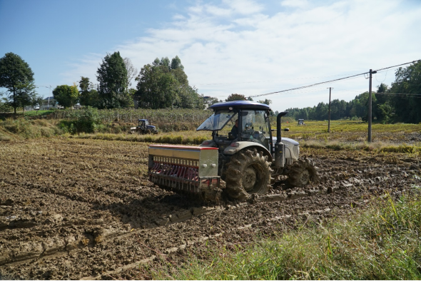 立冬后的田野显得格外空旷,而在现代农业事业部秀水镇新桥村、蟠龙村2000余亩流转土地上,却呈现出一片热火朝天的小麦播种场景。